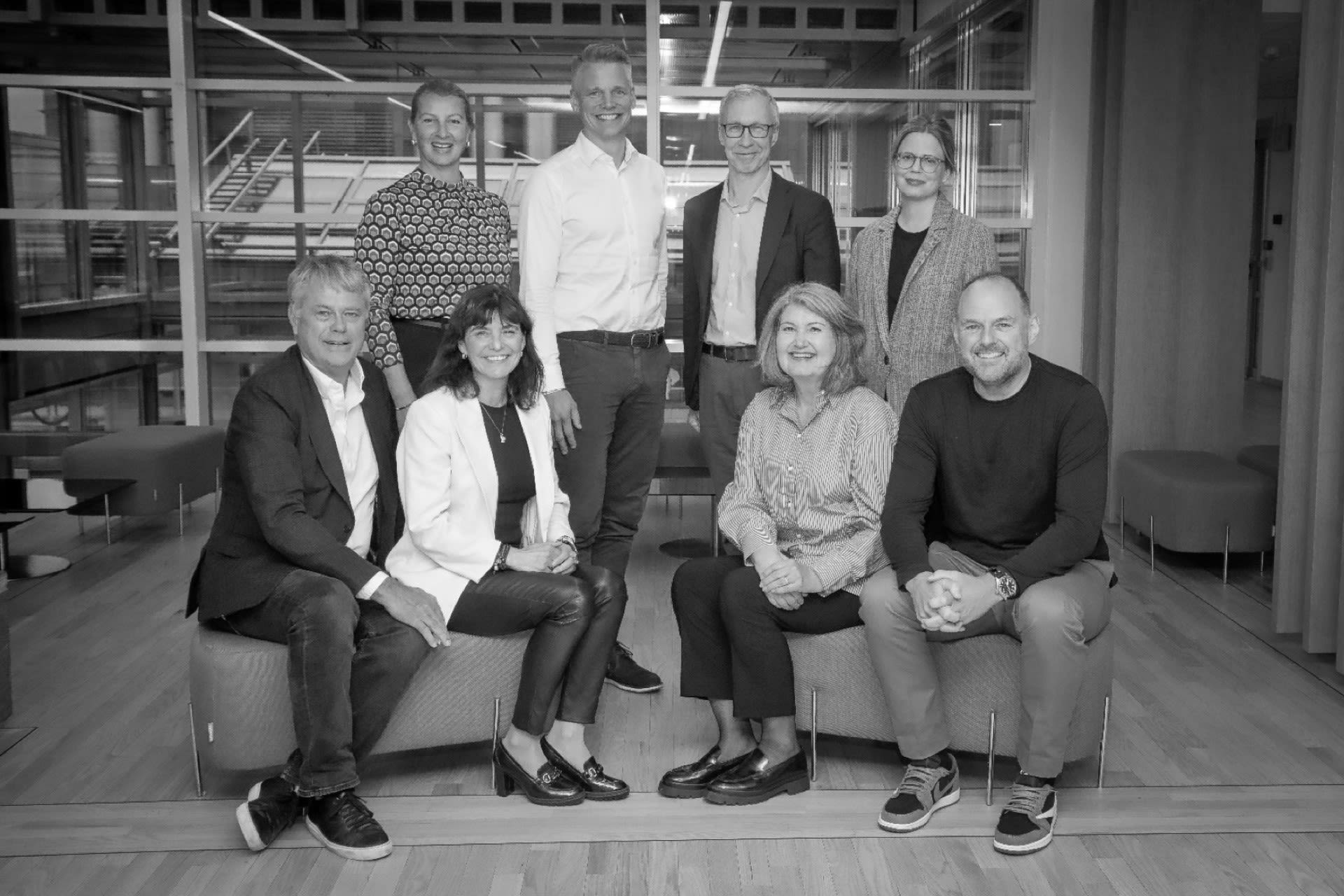 Styret i Scibsted Media. Bak fra venstre: Ingrid Bojner, Sondre Gravir, Hans Mjelva, Jonna Sima (varamedlem for Marita Elena Valvik, som ikke var til stede da bildet ble tatt), Michael Hallén, Kjersti Løken Stavrum, Maria Carling og André Christensen.