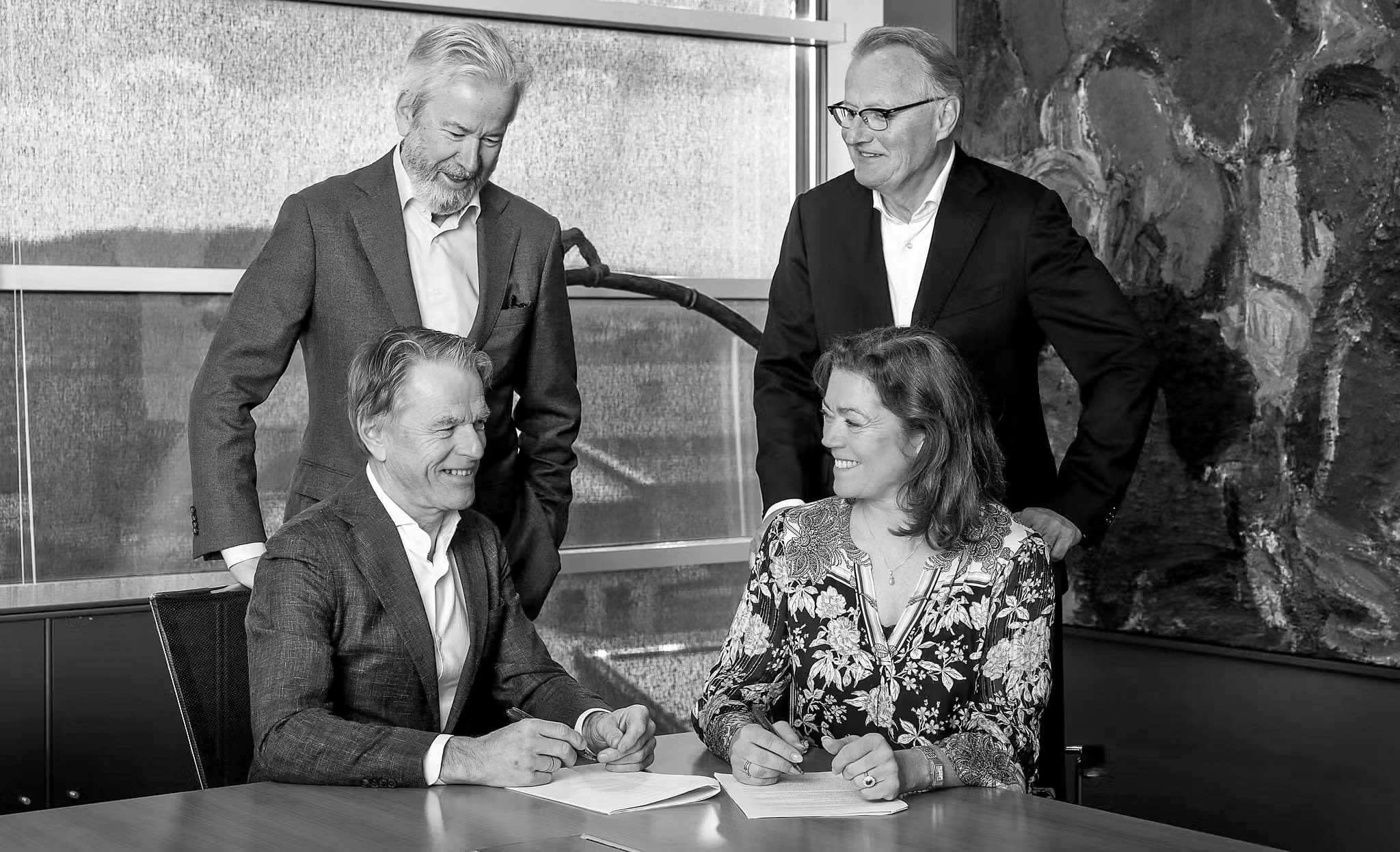 Til venstre: Ole Jacob Sunde og Trond Berger som representerer Stiftelsen Tinius og Blommenholm Industrier. Til høyre: Rune Bjerke og Kristin Skogen Lund som representerer Schibsted. Foto: Kilian Munch