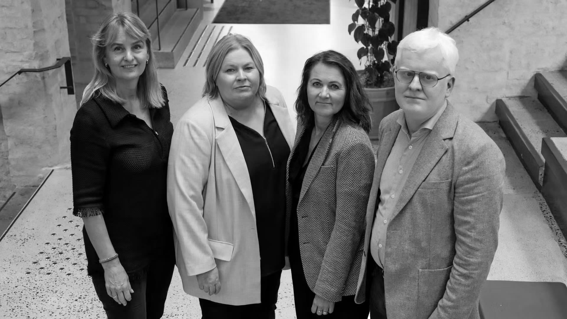 Medieorganisasjonene er partshjelpere i søksmålet mot staten. Fra venstre: Administrerende direktør i Mediebedriftenes Landsforening, Randi Øgrey, generalsekretær i Norsk Presseforbund, Elin Floberghagen, generalsekretær Reidun Kjelling Nybø i Norsk Redaktørforening og leder i Norsk Journalistlag, Dag Idar Tryggestad. Foto: Christine Tolpinrud